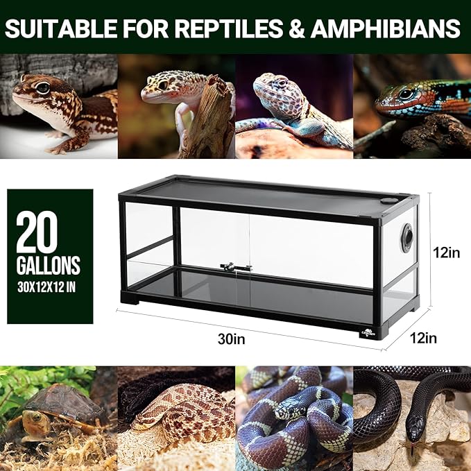 - Professional and Sturdy Structure: 20 gallon reptile terrarium adopting a rectangular design, Made of high quality tempered glass and aluminum supports, the size is 30" x 12"x 12", sufficient space for tank decor, reptile hides, food bowls and other tank accessories, ideal habitat for medium bearded dragon, lizard, crested gecko, frog, snake, tortoise and more.