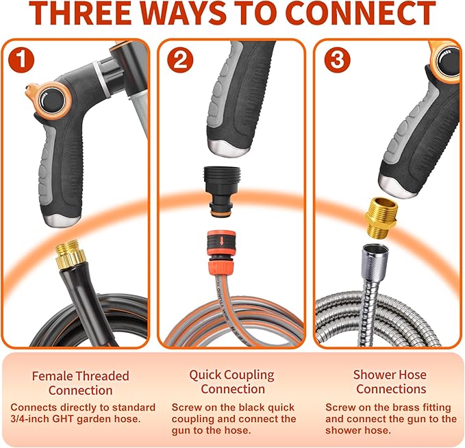 - 【Strong Applicability】The dog wash hose attachment can be connected to garden and shower hoses. To connect the garden hose, simply connect the standard 3/4-inch GHT garden hose directly or screw on the black quick-connect head to connect the hose. To connect the shower hose, you need to use the brass bathroom hose connector (not included)