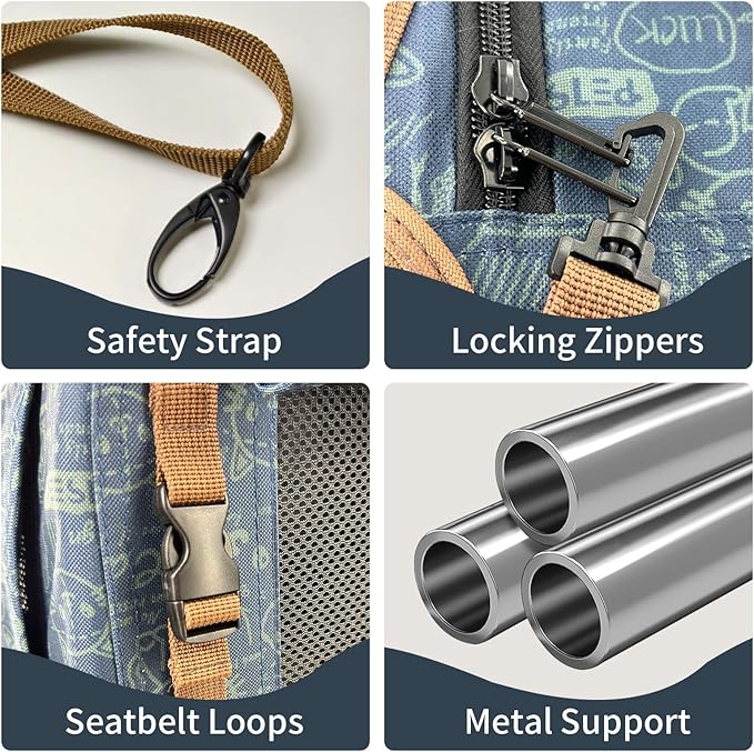 - SAFETY DESIGN- Each access has a zipper lock to prevent cats from escaping. On the side have seatbelt loops, can fix the carrier in the car. The internal metal support structure may also provide good protection for pets.