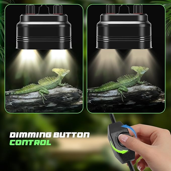 - Brightness and Temperature Control: Our dimmable dual reptile light fixture has 2 types of independent switches, one for UVA/UVB lighting switch control and one for heating lamp brightness/temperature adjustment. You can adjust the appropriate and comfortable lighting environment for your pet at will.