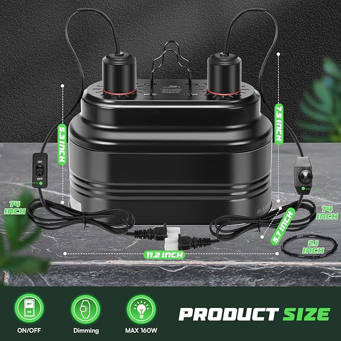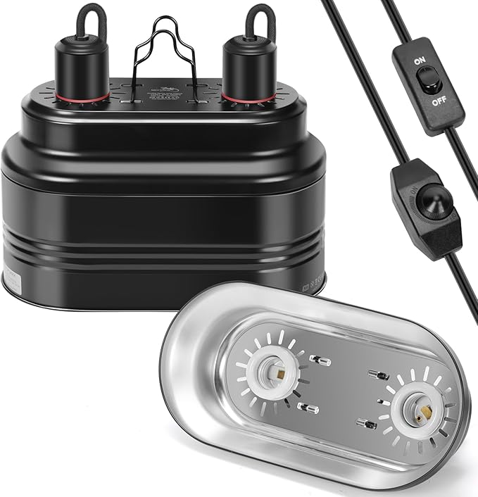 - Suitable for Most Bulbs: The reptile lighting fixture with dimming is equipped with an E26 heat-resistant ceramic lamp holder and an integrated double lamp head design, which can be used with most bulbs used for reptiles, such as UVA, UVB, reptile ceramic heating lamps, and basking lamps, heating lamps, fluorescent lamps, luminous lamps, energy-saving lamps, infrared spotlights, etc. (Max 100W).