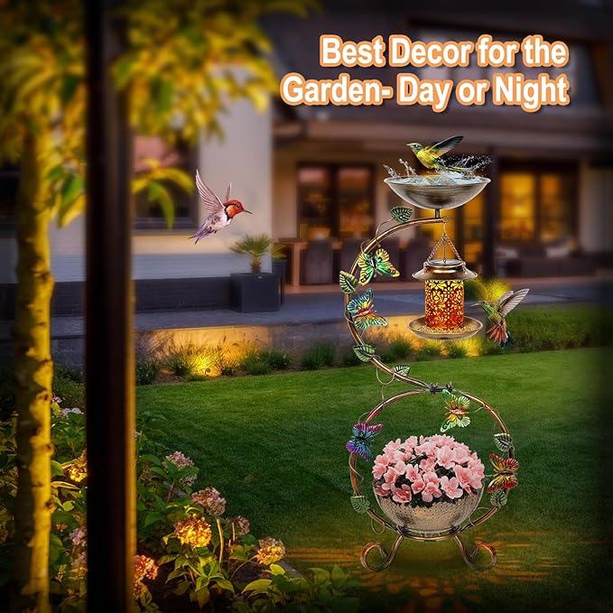 - 🐦【Upgraded 3-In-1 Design】Our outdoor bird bath combine bird bath bowl, solar bird feeder, planter in one. The top is a bird bath where birds can drink or bathe, the middle is equipped with a solar-powered bird feeder where birds can eat, and the bottom is designed with a flower pot base where plant can be placed for decoration. Make garden very attractive day and night.