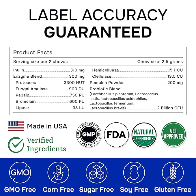 - Top-Tier Probiotic Treats: Offering the best in dog digestive support, our probiotic chews for dogs are packed with probiotics, prebiotics, enzymes & pumpkin fiber to maintain your doggie's active and healthy life