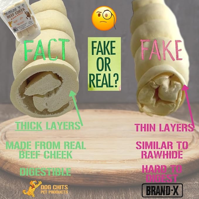 - BEST RAWHIDE ALTERNATIVE: Dog Chits Beef Cheek Chews are the top choice for a long lasting chew. Watch out for beef cheeks made with thin layers, similar to rawhide, which are often processed with chemicals or preservatives and can be hazardous for your dog. Dog Chits chews are made from REAL BEEF CHEEK and won't cause harmful stomach blockages.
