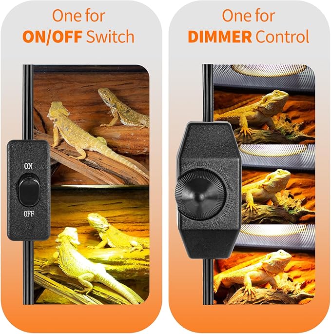 - 【Reptile Lamp Fixture Combo】: The OiiBO 2-Pack Dome Light Fixture with 2 different switches: one for the UVA/UVB lighting on/off switch and one for adjusting brightness/temperature of the heating lamp. This combination can meet both heating and UVB needs for reptiles simultaneously. (Bulb not included)