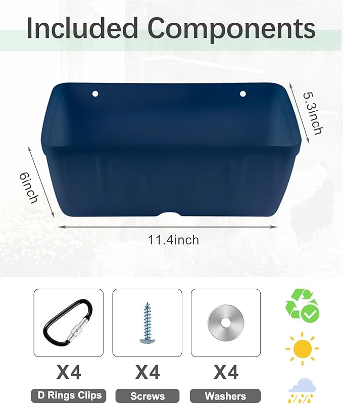 - Hanging feeders for chickens: Chicken feeders come with clips, they can be hung from coop. We can easily move the chicken feeders to a different location in the coop as needed.