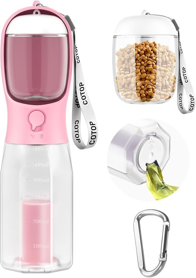 20oz Dog Water Bottle with Food Container & Poop Bag Dispenser | Leak-Proof Portable Pet Water Dispenser with Carabiner Clip | for Walking, Hiking, Travel