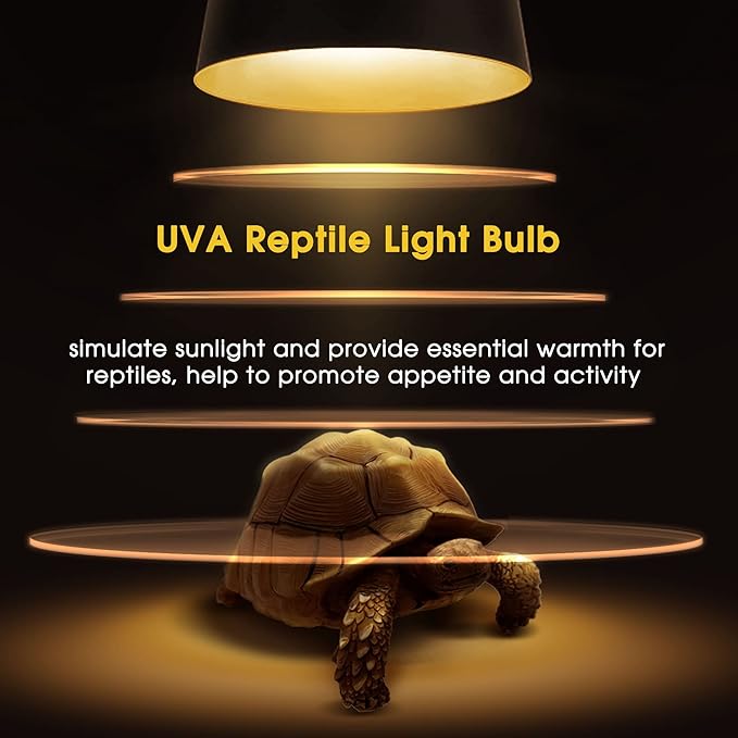 - Promote Natural Behavior: Our reptile heat lamp bulbs mimic your pet's natural habitat by offering a steady heat source. With gentle lighting that doesn't disrupt their daily routine, it supports their natural activity cycle. Plus, the stable UVA output promotes essential behaviors like activity, digestion, and reproduction.