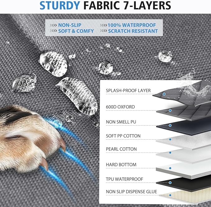 - 【Hard Bottom,Durable Material】This back seat extender for dogs is made of stronger but softer material. It is made of PU layer, which is flavorless and also waterproof. The surface is high-density firm Oxford cloth, more durable and easy to clean. Pearl cotton is sandwiched in the center, more soft. Thickened hollow board is more solid and not easy to bend. Encrypted and thickened webbing and lock buckle are more advanced and durable.