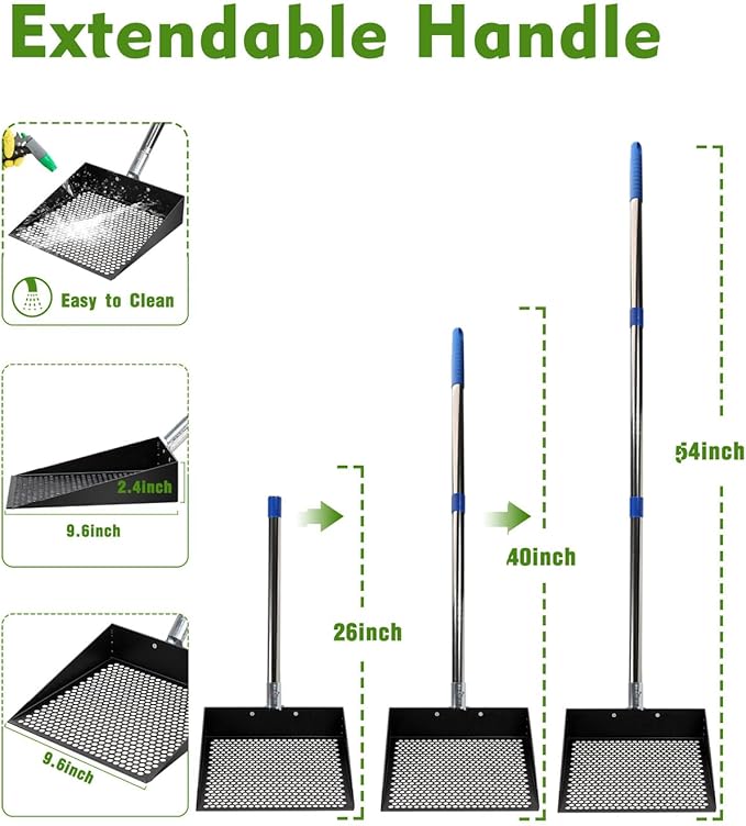 - 【Extended Handle for Ease of Use】 Equipped with a 44.5in long handle made of sturdy stainless steel, this litter scooper allows you to clean the chicken coop without the need to bend over excessively. This design reduces strain on your back, ensuring comfort during use and making it one of the most practical chicken coop cleaning tools.