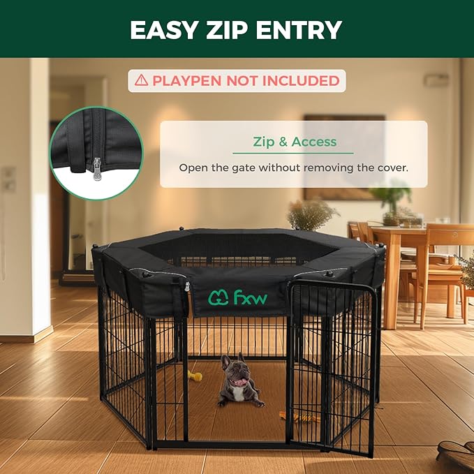 - Tightly Secured: Born from the thoughtful insights of FXW members who sought an extra measure of security, this dog playpen cover aims to address the concern of preventing dogs from jumping out or escaping. Designed to seamlessly integrate with our FXW Heavy-Duty Dog Playpen, this pen cover boasts a fully enclosed structure, reinforced fabric, and 16 hooks & loops for security. It ensures your dog stays safely within their play area.