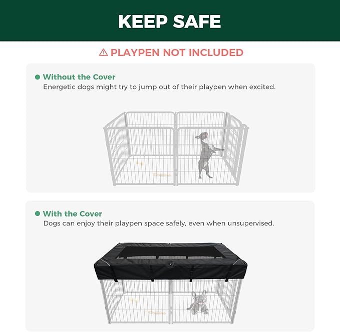 - Tightly Secured: Born from the thoughtful insights of FXW members who sought an extra measure of security, this dog playpen cover aims to address the concern of preventing dogs from jumping out or escaping. Designed to seamlessly integrate with our FXW Heavy-Duty Dog Playpen, this pen cover boasts a fully enclosed structure, reinforced fabric, and 16 hooks & loops for security. It ensures your dog stays safely within their play area.
