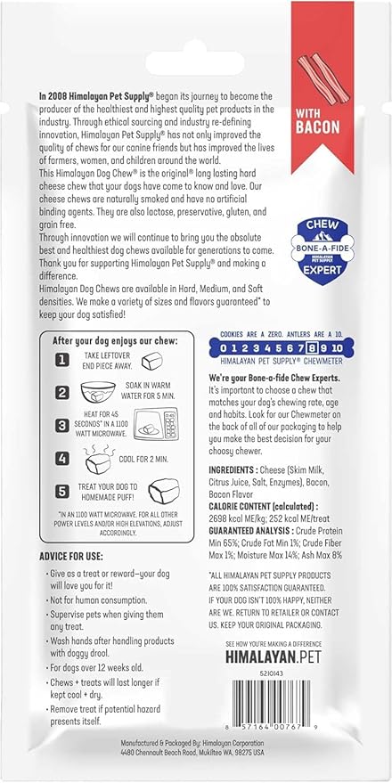 - PACK INCLUDES: Included is one large, 3.3 oz Bacon Himalayan Dog Chew. Ideal for dogs 55 pounds and smaller, not for dogs younger than 12 weeks. PRO-TIP: After your dog enjoys the chew, take the leftover piece away, soak in warm water and microwave for a homemade cheese puff your dog will love!