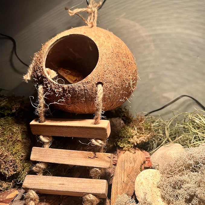- Multifunction:Lizard Coconut Shell hideout hut not only acts as a burrowing habitat and pet safe shelter,but can also be used to store food. Reptile shell nests aren't just for small animals. The hanging design can also be used as a patio decoration
