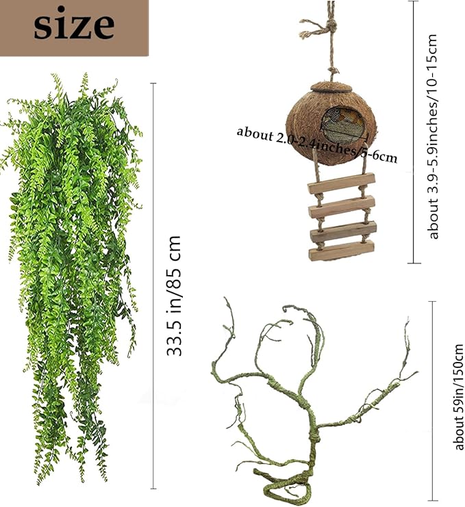 - Package Includes: a coconut shell,a simulated vine,a green simulation vine decoration.Diameter of the coconut nest is about 3.9-5.9 inches /10.0-15.0cm,opening diameter is about 2.0-2.4 inches /5.0-6.0cm.Suitable for geckos,lizards,corn snakes,etc