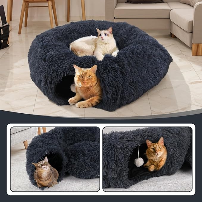 Cute Donut Cat Tunnel, Large Foldable Fluffy Tunnel with Washable Pads and Toy Balls for Indoor Cats