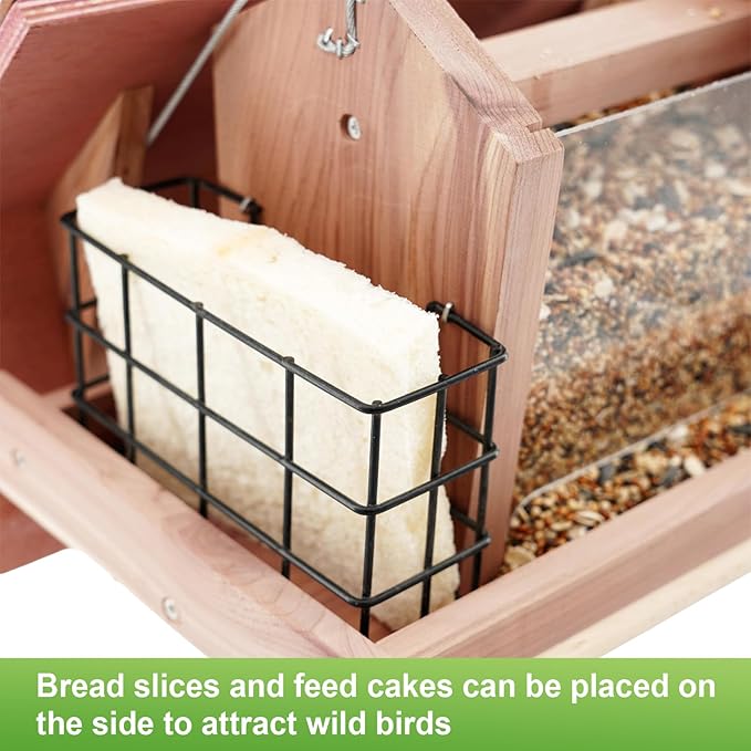 - [Drainage Feature]: Liawm wooden bird feeders are with wood roof and the transparent baffle design, help keeping water out of your bird feeder, it keeps birdseed dry while allowing birds to easily see and access food, meanwhile our bird feeder gives the birds a good foothold and makes it easier for them to eat the feed.