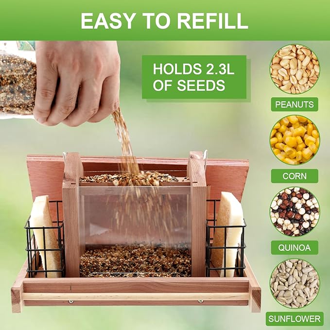 - [Large Capacity]: Our products measure 11x7x7.5 inches and can hold up to 2.3 pounds of birdseed, you can fill with a variety of birdseed to attract wild birds such as: sunflower seeds, peanuts, quinoa, corn kernels, etc.In addition to storing seeds, there are two suet cages on the side, and you can also put feed cakes for the birds to enjoy.