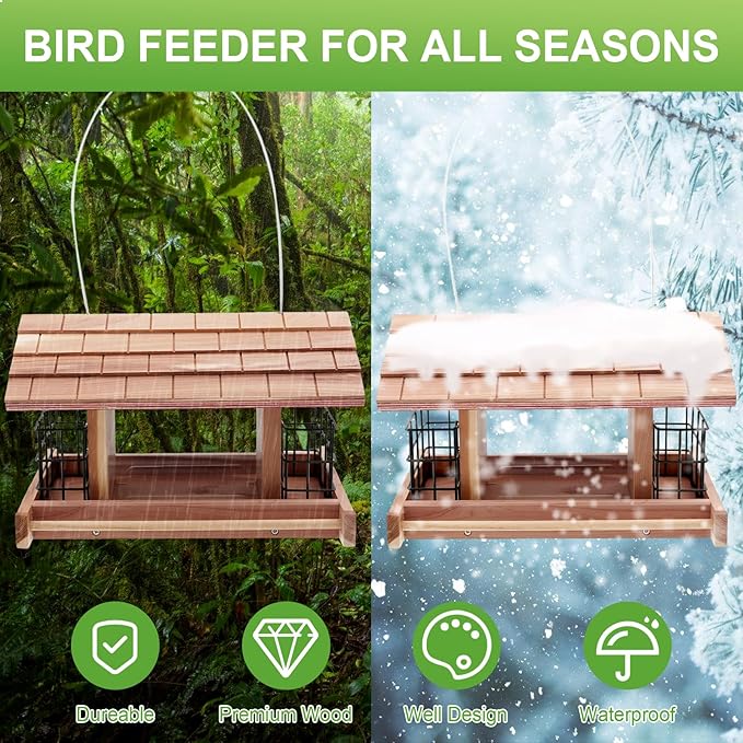 Wooden Bird Feeder for Outdoors Hanging Mount Large Capacity, Red Cedar Garden Roof Feeder with 2 Suet Cages, Cardinal Bluebird Birdfeeder for Garden Decoration Yard, Weatherproof Durable