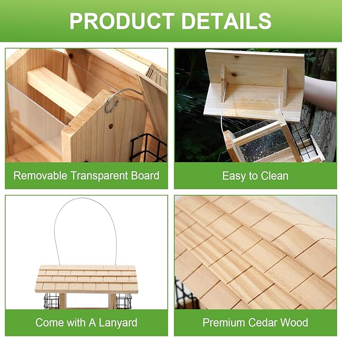 - [Drainage Feature]: Liawm wooden bird feeders are with wood roof and the transparent baffle design, help keeping water out of your bird feeder, it keeps birdseed dry while allowing birds to easily see and access food, meanwhile our bird feeder gives the birds a good foothold and makes it easier for them to eat the feed.