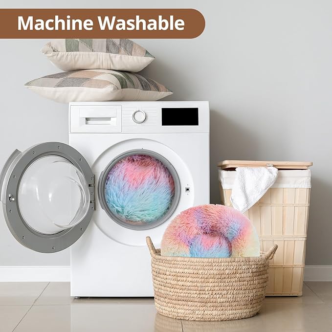 JOLLYVOGUE Large Calming Dog Bed, Anti-Anxiety Donut Cuddler Cat Bed with Anti-Slip Bottom, Fluffy Faux Fur Machine Washable Pet Cushion for Medium Large Dog & Cat, 36"/Rainbow