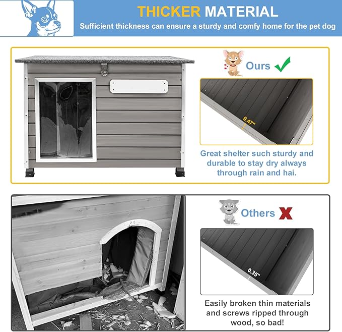 - 🐶🐕【Exquisite Dog House Weatherproof】Write your pet’s name on the doorplate to give them a sense of home. Removable PVC Curtain protects your pet from wind, rain, and natural predators. Easy-to-open slanted asphalt roof protects against wind and water.Facilitates easy feeding and cleaning. This dog house offers a combination of practical and thoughtful design features, ensuring your pet feels at home and stays protected from the elements.