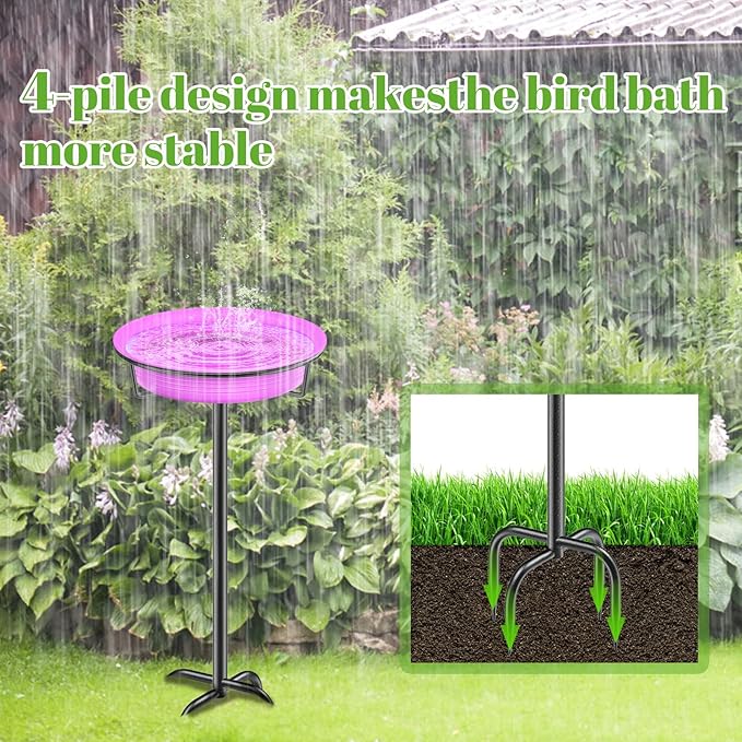 - 【Sturdy Base】Heavy duty steel stake with 4 solid prongs makes this bird bath stay in the soil of your garden upright and firmly. This birdbath is uneasy to bend, break or fracture, keeping your yard or garden full of songbirds all year long.