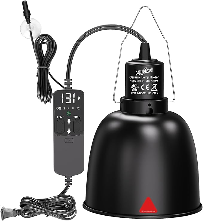 - 【Reptile Light Fixture】Fliywarl reptile light fixture with timed thermostats can conveniently manage your pet's lighting and heating time. You can set a suitable temperature and timing according to your pet's needs. The reptile fixture uses E26 ceramic lamp heads, which can withstand a maximum of 160W.