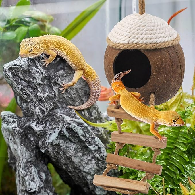- Safety Materials:Crested gecko coconut hut consists of natural coconut shell, cap made of twine and wooden ladder ,hat woven with hemp rope will increase friction to leopard gecko that crawling on the top of the hanging coconut den and keep it safe