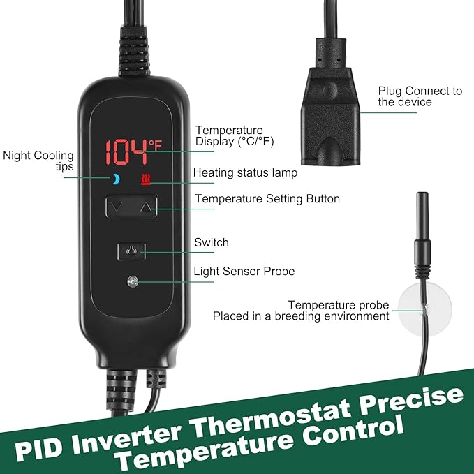 - Two Modes Available: The heat lamp thermostat for reptiles is designed with two working modes for you to choose from. The PID constant temperature control mode not only improves the stability and efficiency of temperature control but also helps to prolong the service life of the reptile heat bulb. In addition, in day/night temperature difference mode, the light-sensitive probe can sensitively detect changes in natural light and automatically cool down by about 4°F at night, creating a more natural, stable, and comfortable habitat for reptiles. (Please note that the nighttime temperature difference mode needs to be turned on manually.)