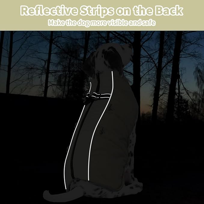- Easy to Wear: This warm dog coat equips with a smooth zipper on the back for quick and hassle-free dressing, while the self-locking design keeps it securely in place. The dog coats for winter with adjustable drawstrings at the neck and back ensure a snug fit, and hind leg straps prevent the coat from shifting during movement, keeping your dog warm and comfortable all the day.