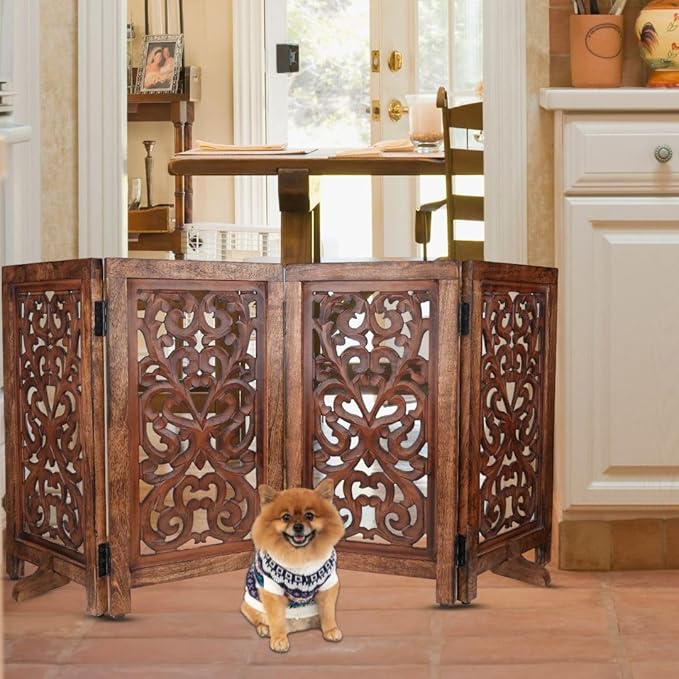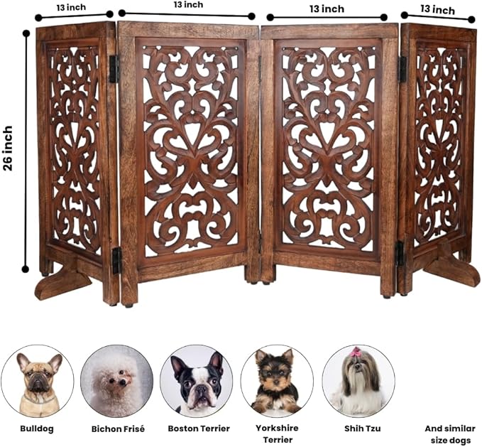 Decorative Wooden Pet Gate, Dog Fence, Cat Gate, Foldable, Adjustable, Portable, Extra-Wide, Wooden Dog Barrier, Free-Standing Puppy Gate 4 Panels for Indoor, Doorways, Stairs-26x52 Inch Burnt Antique