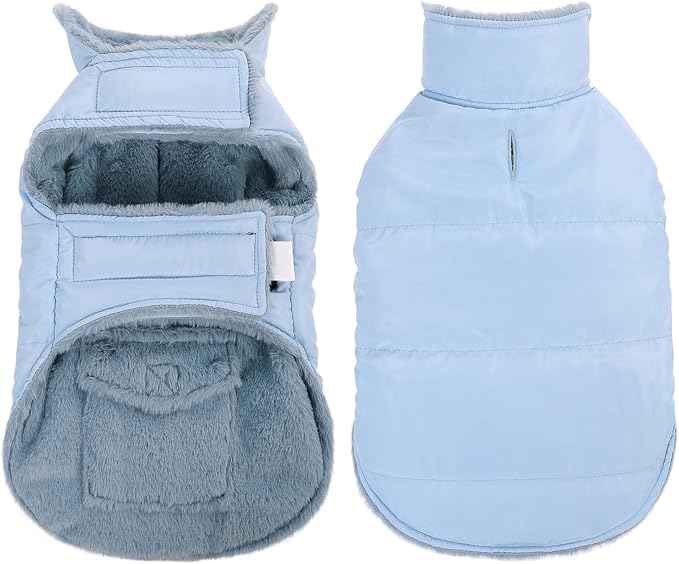 - CREATIVE DESIGN: ASENKU dog winter jackets can be two-sided worn, with the magic sticker closures around the neck & belly that can easy to adjust the size to fit your dog, also easy to wear and take off. The Plaid fabric side also has a pocket on the back, you can store some small things in it.