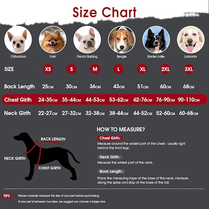 - SIZE INQUIRY: If you don't make sure which size to choose, you can measure your dog firstly then contact us for a recommended size. We are pleased to help you to choose a suitable dog coat for your furry friend.