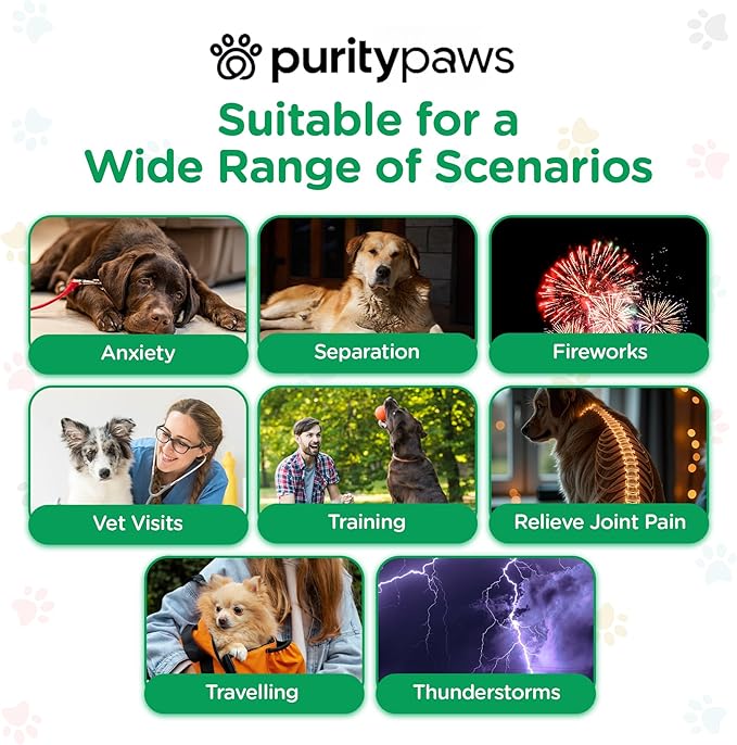 - Reduces Stress and Anxiety: Purity Paws dog calming treats are formulated to relax your dog during the most stressful situations like thunderstorms, fireworks, visits to the vet, barking, traveling or being left behind by their owners. The soft chews soothe the anxiety and nervousness, and where there is fear or restlessness, they are comforting. Not only does this enhance their emotional well-being, but it also strengthens the pet-owner relationship.