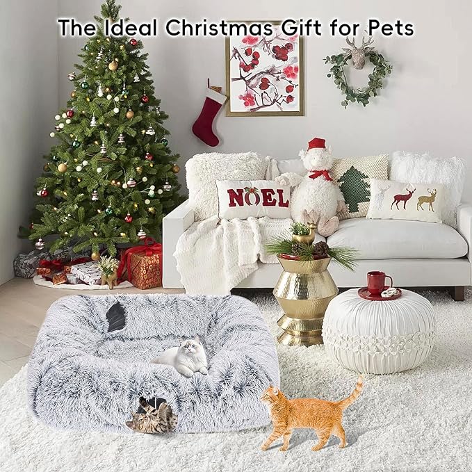 - Multifunctional Cat Bed & Tunnel: The cat tunnel bed with cat cave consists of a fluffy middle cat bed and two cat tunnels, with horn button connection design that can be pieced together to form a extra large square, a long tunnel or used alone as two cat tubes, suitable for cats and dogs indoor play, hiding and resting