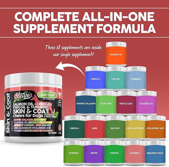 - Salmon Oil For Dogs Skin And Coat: Concentrated doses of vitamins and minerals that support overall skin health and immune support. Ingredients like turmeric capsules, aloe powder, nettle leaf extract, ground flaxseed, and collagen peptides powder support all dogs including pets with skin sensitivities. Inclusion of salmon oil dogs, fish oil 1200 mg, msm supplement, and omega 3 fatty acid supplements add additional foundation for optimal skin and coat health for your pet.