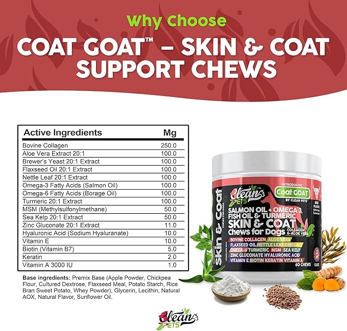 Salmon Oil Omega 3 Fish Oil for Dogs Skin and Coat Supplement | Dog Collagen Aloe Vera Biotin Keratin Flaxseed Nettle Leaf Sea Kelp Hyaluronic Acid Brewers Yeast Vitamin A - Coat Goat