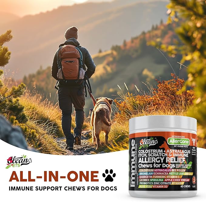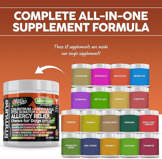 - Colostrum For Dogs With Astragalus Root: Dog immune and allergy supplement with a powerful blend of colostrum supplement, astragalus capsules, bee pollen organic, echinacea herb, nettle capsules, omega 3 fish oil, turmeric powder, vitamin E, licorice root extract and quercetin with bromelain. These dog allergy chews also contains apple cider vinegar capsules, probiotics, zinc 50mg, vitamin C 1000mg, aloe vera, and vitamin D3 for added support in delicious beef flavor.