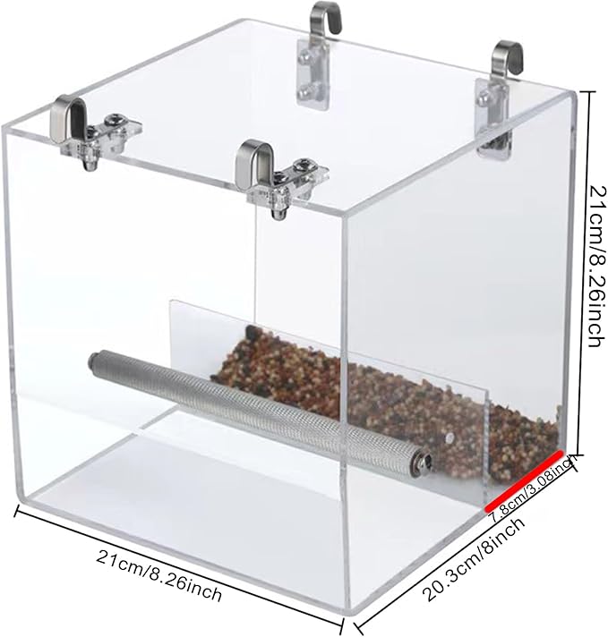 - HEALTHY MATERIAL: Our bird feeder cage is made of clear acrylic, which is thick, safe, non-leakage, and easy to clean. The hooks used to secure the cage are made of high quality stainless steel and are rust-resistant, sturdy and durable