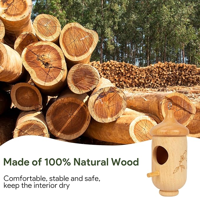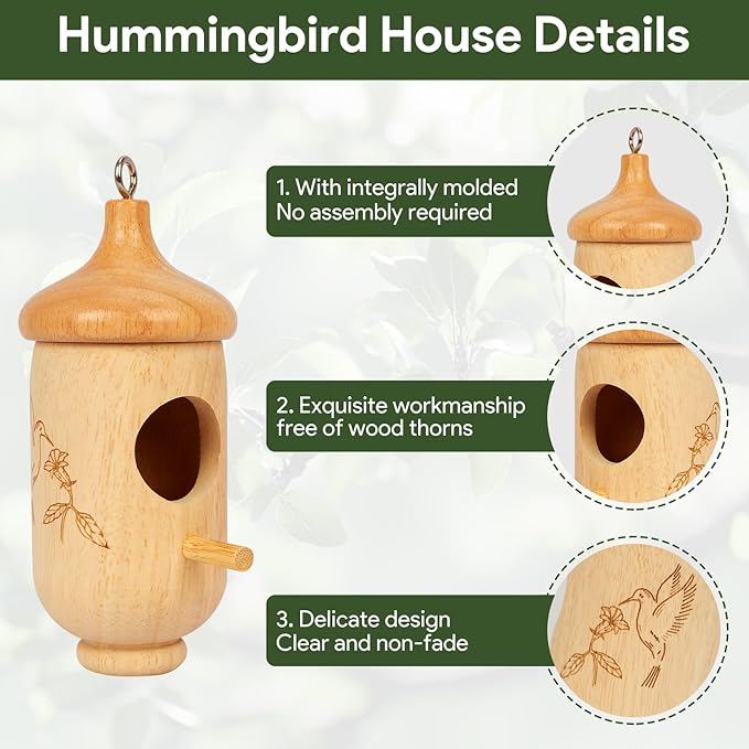 - 【Natural Wooden Hummingbird House】Hummingbird houses for outside are made of natural boxwood, which have a more natural taste and are easier to attract hummingbirds to build their nests. They are environmentally friendly and durable, strong and breathable, and can be used for a long time. Even in season without hummingbirds, hanging hummingbird nest house is perfect addition to the patio, garden, or backyard