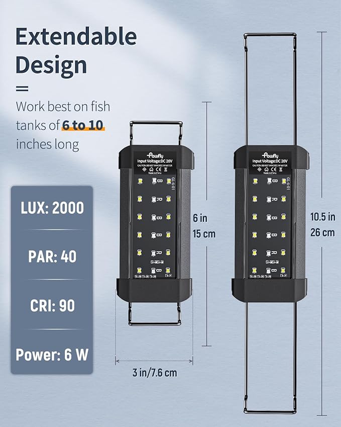 - For 6" to 10" Tanks: With an extendable bracket (min length: up to 6"; max length: up to 10.5"), the LED aquarium light always stays steady on the fish tank. Work best on tanks of 6 to 10 inches long.