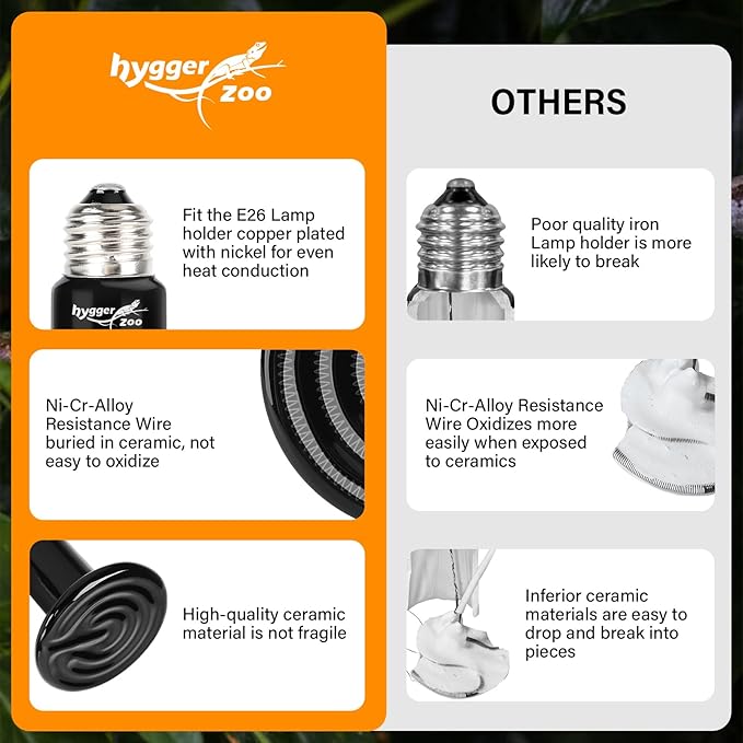 - 100% Heat Efficiency - The intensive Ni-Cr alloy heating wire ensures optimal heat transfer and extends the service life of the Ceramic Heat Emitter. After turning on the reptile ceramic heat bulb for 10 seconds, you can clearly feel the rapid rise in temperature, reaching the rated temperature in just 4 minutes. Its solid ceramic construction is waterproof and explosion-proof, providing safe heating without the risk of temperature-induced cracking.