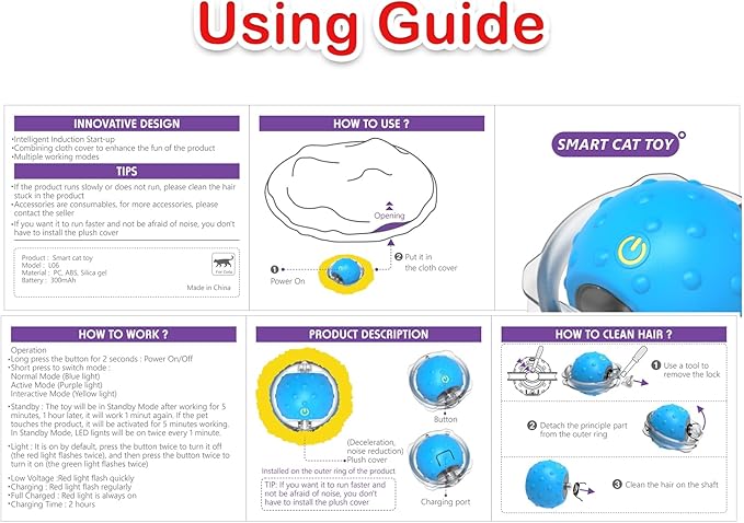 - 【Long press 5s to power on】 just distinguished the working mode by LED light. Fast rolling(blue light), Slow rolling(purple light), and interactive mode(yellow light). Under interactive mode, ball only active when cat pat it, responsive interaction gaming really gets their attention