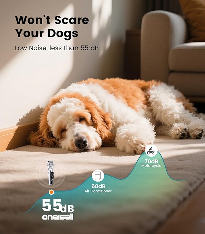 - Low Noise: This dog clipper set stays under 55dB—no scary buzzing to stress your furry friend