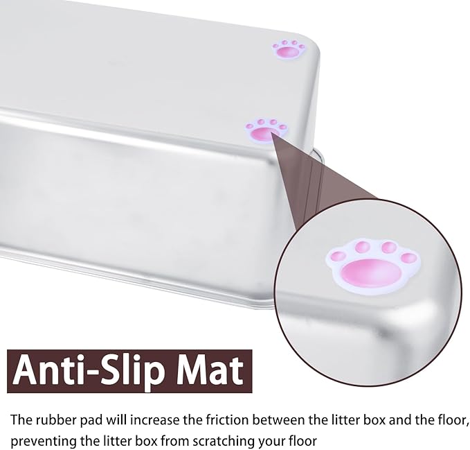 - ANTI-SLIP: Each stainless steel cat litter box comes with four non-slip pads to prevent the litter box from moving and scratching your floor. The four corners of the cat litter box are rounded corners to protect your cat from being scratched. The edges of the cat litter box are also thickened to make it easy for you to grab