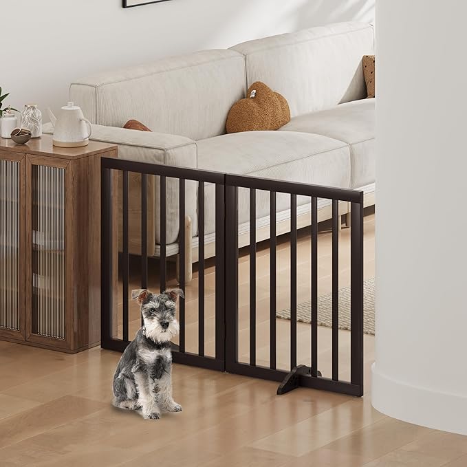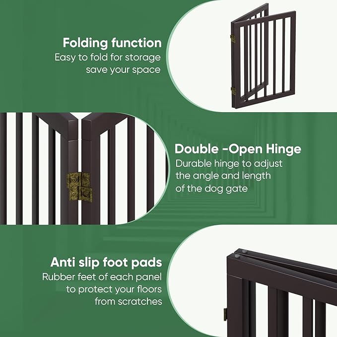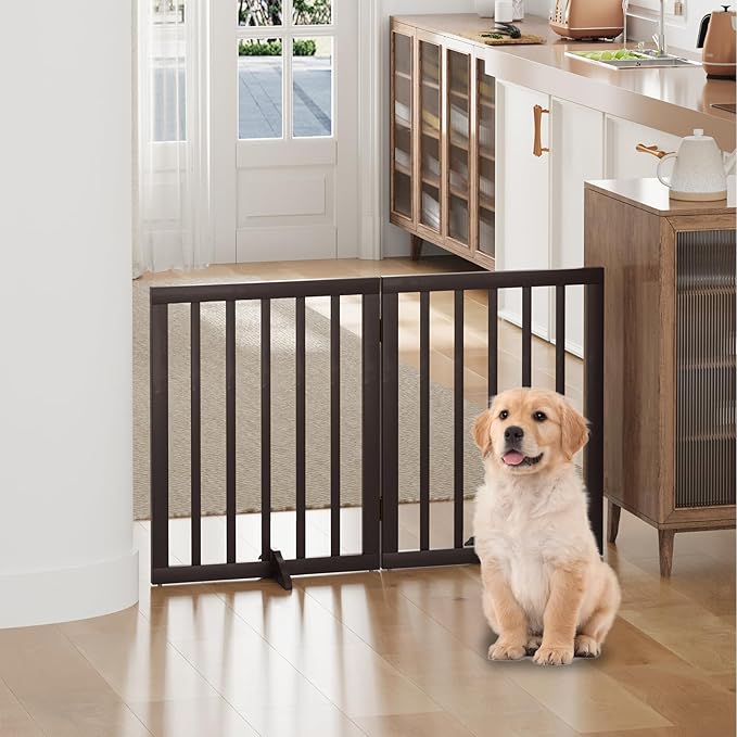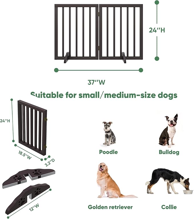 - ๐ถRetractable Design: The dog gate indoor is made into a retractable design. The 360ยฐhinge allowed you to adjust it in any shape. You can adjust the length of the freestanding dog gates for your need and fold it up and store it when not in use. Fully expansion size: 36โW x 24โH x 0.7โD.