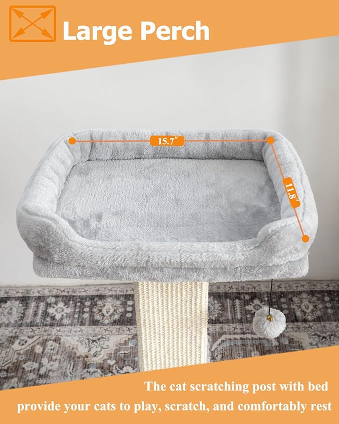 32" Cat Scratching Post for Indoor Cats, Sisal Cat Scratcher with Plush Perch, Large Scratch Post with Bed, Removable Cover, Sisal Fabric,Light Grey