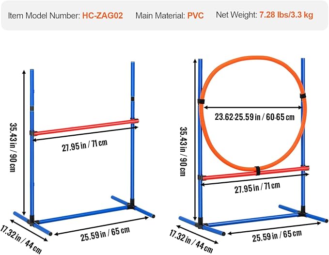 - Adjustable Heights & Larger Ring: To suit dogs in different sizes, the height of the dog jump bar is adjustable between 3.9" and 31.5", and the diameter of the jump ring is larger and adjustable between 23.62'' and 25.59''. Our dog agility course kit is suitable for small dogs, medium dogs, large dogs.
