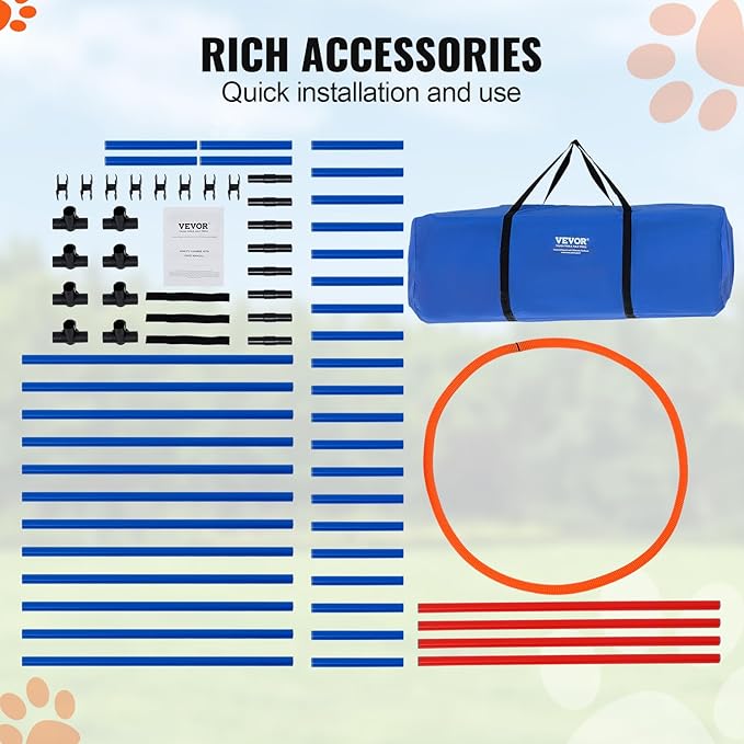 - Lightweigh and Carrying Bag Included: This dog obstacle course kit is lightweight and comes with a storage bag, easy to carry around and use both indoors and outdoors like living rooms, balconies, garage, backyards, lawns, parks and so on.